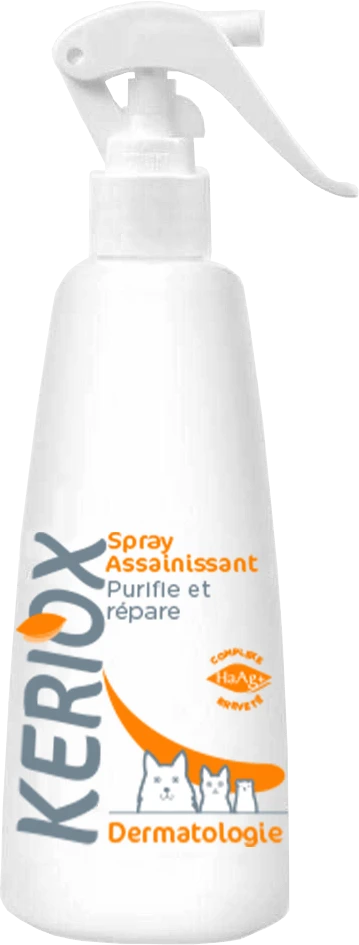 - Comme pour Keriox Shampoing Assainissant, il associe le complexe HaAg+ (acide hyaluronique + argent micronisé) à un complexe argino-lipidique et permet de maintenir la peau de l’animal dans un état sain sans détruire l’écosystème cutanée.